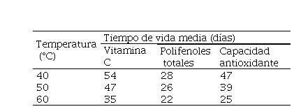La energía de activación (Ea) requerida para la degradación de los compuestos bioactivos fue de 17.93 Kj/mol para vitamina C, 8.84 Kj/mol para polifenoles totales y 26.52 Kj/mol para la capacidad antioxidante.