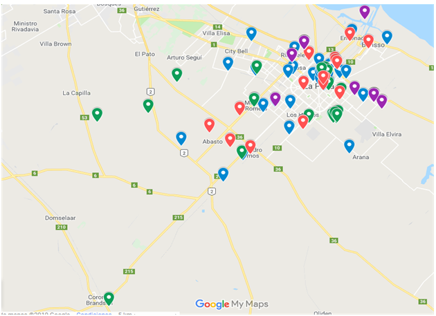 Un mapa sobre la distribución de las sedes de los proyectos durante el año 2018 también nos ayuda a visualizar la inserción territorial de las actividades de la Facultad más allá de sus muros. Puede observarse que la incidencia territorial de los proyectos concentra sus fuerzas en la región más inmediata (La Plata, Ensenada y Berisso), acompañando el proceso de regionalización de la UNLP en general. Al mismo tiempo, se puede señalar cierta vocación de unir los sitios de la periferia con las zonas centrales y también, mirando con atención las localizaciones en el mapa, podríamos deducir los circuitos y circulaciones que llevan a los equipos desde las áreas centrales de la ciudad hacia los márgenes y las periferias. La mayoría de los puntos marcados en el mapa representan las sedes de movimientos sociales, organizaciones barriales, instituciones educativas, clubes, centros comunitarios, locales sindicales, cooperativas, etc.