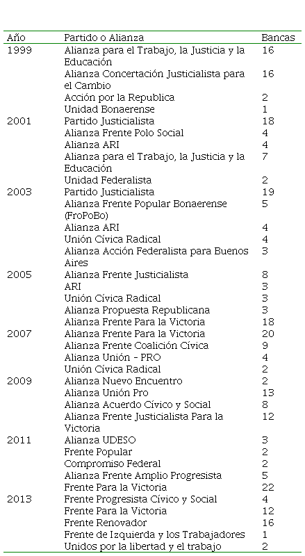 Acerca del período seleccionado, vale destacar que en el distrito se inicia con un fenómeno político novedoso. En 1999, cuando se produjo el ascenso de la Alianza a la presidencia de la República, el justicialismo que hegemonizó la Concertación para el Cambio, ganó la gobernación de la provincia de Buenos Aires en virtud de un acuerdo con otras fuerzas, forjado por Eduardo Duhalde. Pese a ser gobernador de la provincia por dos periodos consecutivos (1991-1995; 1995-1999) “el jefe de los barones del conurbano” no pudo impedir que la Alianza se impusiera en las elecciones legislativas. De manera que el control del peronismo sobre el electorado, tanto más cuando el mismo Duhalde, que se presentaba como candidato a presidente, fue derrotado en las elecciones (Ferrari, 2014; Ollier, 2010b).