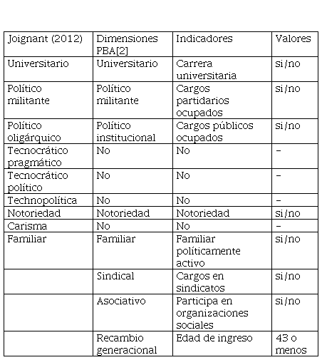 Para este trabajo se retoma, modificándola, la propuesta de Joignant. A partir de la literatura científica y estudios empíricos de carreras políticas, que sugieren el predominio de un número limitado de recursos relvantes, el autor identifica nueve especies de capital político: universitario, político militante, político oligárquico, tecnocrático pragmático, tecnocrático político, technopolítico, notoriedad, carisma. Construye así una tipología realista de capitales que “exige ser confirmada o invalidada a partir de investigaciones empíricas” (Joignant, 2012, p. 609).