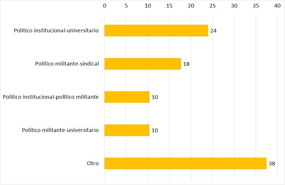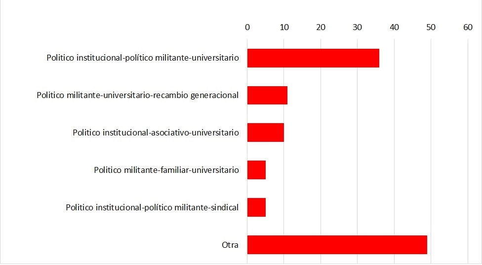 Por otra parte, en cuanto a las estructuras de tipo bidimensional las combinaciones más frecuentes involucran también la dimensión político-militante y el título universitario. Si bien el capital universitario suele formar parte de las especies de capital de las elites (Levita, 2015; Serna, 2005), lo que evidencian estas combinaciones es que para convertirse en DN tiene mayor peso el tránsito por las estructuras partidarias de manera sostenida, es decir, militante.