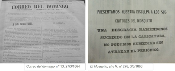 Estas alteraciones, las cuales responden a variables técnicas –como las mejoras en las modalidades de impresión y la incorporación de nuevas tipografías y recursos gráficos–, también ofrecen rastros respecto a la avidez icónica de aquella sociedad. Lo expuesto se refuerza si lo cotejamos no ya con las presencias sino con una ausencia: las jornadas en que ambas publicaciones se vieron imposibilitadas de ofrecerle a sus lectores las correspondientes ilustraciones, el 24/3/1864 el CD, y el 3/5/1868 EM4(Figura 2. Ausencias).