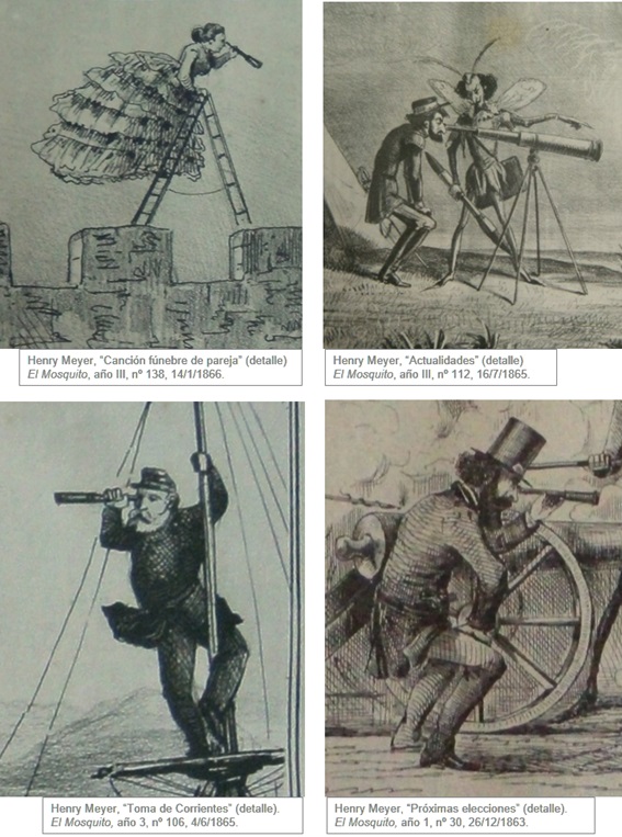Si bien es cierto que el desarrollo de la Guerra del Paraguay (1865-1870) contribuyó a la proliferación de imágenes sobre los campos de batalla y el movimiento de tropas –principalmente en el CD, aunque no únicamente– (Roman 2010, p. 287), conviene remarcar que la presencia del elemento visual constituía novedosos estímulos que instaban a la lectura atenta y detallada de tales iconografías. Esta amplificación de la visión y de lo visible se hace presente también en otros atributos, como la incorporación de dispositivos que permiten “modificar” la mirada. Así es posible advertir numerosas incorporaciones de distintos instrumentos ópticos: desde telescopios a catalejos (Figura 5. Horizontes), pasando por anteojos, lupas e incluso una linterna mágica (Figura 6. Horizontes II).