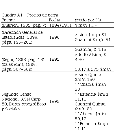 Los datos corresponden a ventas efectuadas durante 1895 en los partidos detallados. De acuerdo con esta clasificación, las quintas y las chacras en Alsina eran notoriamente menores que las de otros partidos vecinos, además sólo se registró una quinta y no hay datos de Guaminí. Estas divergencias en cuanto a tamaños también pueden basarse en el censo, ya que en los datos topográficos y sociales se inquiere “¿Cuánto vale término medio una concesión de veinte hectáreas de tierra para chacra?”, de modo que se puede deducir que ese es el tamaño mínimo de una chacra.[20]
