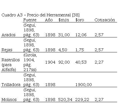 En cuanto a los precios, la búsqueda en fuentes ha sido lo suficientemente exhaustiva, pero por supuesto no la completa; pueden aparecer nuevos datos -o algunos que no haya tenido en cuenta en este trabajo- que habrá que considerar.[34] Ante la presencia de precios diferentes, tomé siempre el que permitía bajar la desigualdad, un recurso arbitrario pero que me pareció más adecuado. En algunos casos esas diferencias, si bien pueden parecer grandes individualmente, perdían transcendencia dada la insignificancia del producto en la masa general, por ejemplo en el herramental.