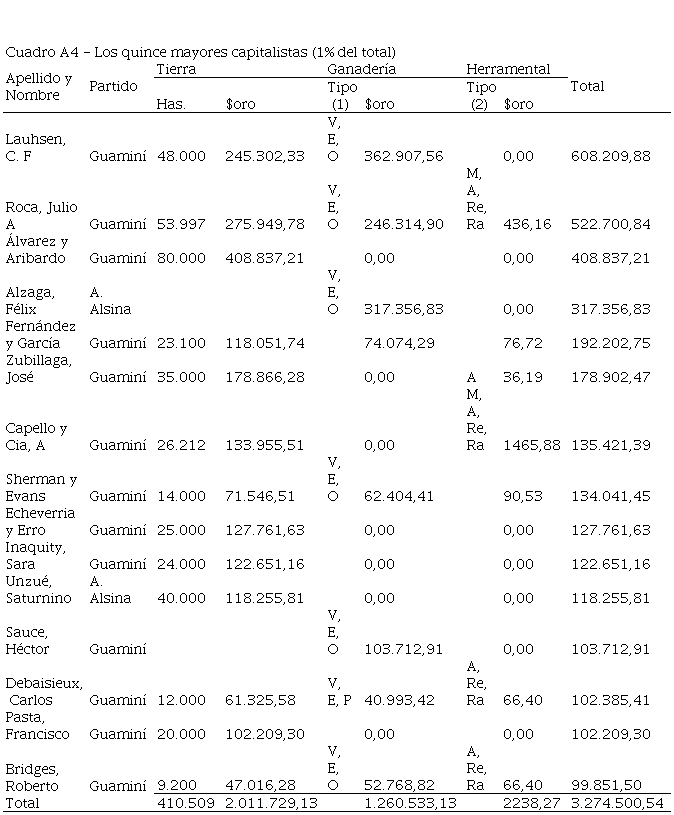 Veamos quiénes estaban en la cumbre de la pirámide de la riqueza. Eran 15 establecimientos, según puede verse en el cuadro A4 del Anexo. Poseían en total 410.000 hectáreas pero había dos que no eran propietarios de tierras, aunque se ubicaban entre estos privilegiados por su ganado. Cinco tenían solo tierra, y otros dos propietarios sin ganado tenían herramientas para agricultura. Tres eran ganaderos exclusivamente, otros cinco compartían esa actividad con la agricultura, y dos eran únicamente agricultores. Como se ve, no se puede asegurar que su actividad principal sea la especulación, ya que gran parte estaba en explotación. Podríamos considerar como inversiones especulativas las 189.000 hectáreas que acumulaban los cinco propietarios que no poseían otro tipo de capital, pero también podían ser propietarios que arrendaban hectáreas a chacareros o criadores de ovejas.
