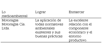La organización Motoragsa Cía. Ltda. en esta dimensión medioambiental se va a orientar a cumplir con todas las reglamentaciones vigentes de cuidado con el medio ambiente, estandares ISO, y seguir con las Certificaciones de calidad otorgadas Intertek y Berau Veritas.