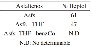 El rendimiento de la reacción, fue de 96% m/m, teniendo en cuenta que la base de cálculo fue asumiendo una masa molecular de 1000 g/mol para los asfaltenos.