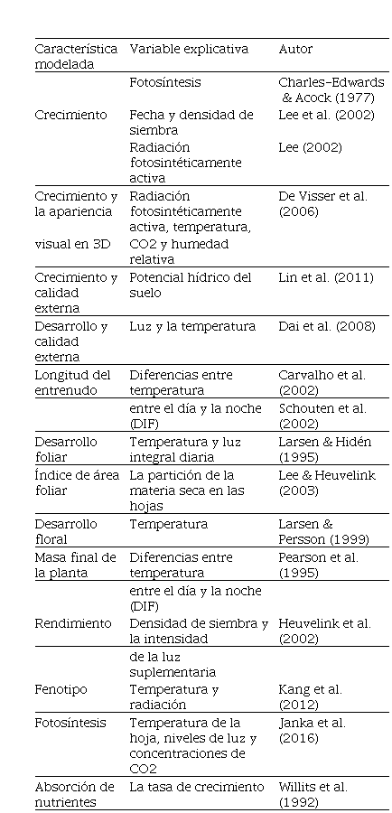 Globalmente, la FAO y varios países han avalado e incluso apoyado con recursos tanto el desarrollo como la implementación del modelamiento en la agricultura, como uno de los enfoques para entender el funcionamiento del sistema agrícola y en consecuencia se constituya en una herramienta para la toma acertada de decisiones de manejo (Jones et al., 2017). Cabe aclarar que el modelamiento en la floricultura y especialmente en crisantemo no es un tema nuevo, ya que desde 1977 autores como Charles-Edwards & Acock (1977) presentaron una propuesta de modelo semi-empírico incorporando procesos como la fotosíntesis a un modelo de crecimiento dinámico para crisantemo. Como ese, se pueden encontrar en la literatura una amplia variedad de modelos como los que se presentan en la Tabla 2.