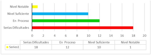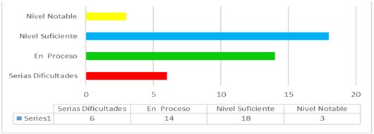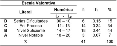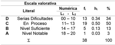 El nivel de investigación del presente trabajo de investigación fue el nivel experimental; ello permitió explicar cómo la aplicación de materiales educativos etnomatemáticos favorece el aprendizaje y enseñanza de la matemática. El diseño de investigación que se planteó según Hernández, Fernández y Baptista (2002), corresponde al cuasi- experimental donde la muestra se divide en dos grupos. Para eso, los resultados de la preprueba del grupo experimental, arrojó los siguientes resultados: serias dificultades, 18 estudiantes, en proceso 12, nivel suficiente 10, nivel notable 1. En el grupo control 15 estudiantes mostraron serias dificultades, en proceso, 13 estudiantes, 8 en el nivel suficiente y 2 en el nivel notable. En la posprueba del grupo experimental los resultados fueron: 6 estudiantes que representan a D, donde las notas corresponden a serias dificultades, con un porcentaje de 15%, 14 estudiantes en C, es decir en proceso, con 34%, un porcentaje bastante numeroso; 18 estudiantes que pertenecen a B; nivel suficiente con un porcentaje de 44%, y con un porcentaje de 7%, 3 estudiantes que pertenecen a nivel notable, muy distinto al grupo de control con 13 estudiantes de un 34% con D, serias dificultades, 19 estudiantes con escala de C; en proceso con un 50%, 5 estudiantes en B, nivel suficiente, 13 % y, finalmente, 1 estudiante de nivel notable, haciendo un 3%.