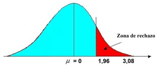 El valor de Z = 3,08 se ubica a la derecha de Z = 1,96 que es la zona de rechazo, por lo tanto, rechazamos la hipótesis nula y aceptamos la hipótesis alterna; es decir, existe indicios suficientes que nos prueban que la enseñanza y aprendizaje de la matemática a través de la aplicación de materiales etnomatemáticos en el grupo experimental (V semestre), es mayor que aquellos estudiantes del grupo de control (III semestre).