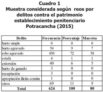 La población de reos en carcel procesados y sentenciados por delitos contra el patrimonio fue de 624 internos.