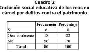 La investigación demuestra que el 70% de los reos en cárcel por delitos contra el patrimonio encuestados, afirman que no existe inclusión social educativa para ellos; en tanto que el 22% señalan que ocasionalmente apreciaron ciertas manifestaciones de inclusión social educativa, y solo el 8% señala que sí hubo inclusión social educativa. Es muy importante también señalar que el 33% de los encuestados no poseen estudios, el 33% poseen estudios primarios, el 29% tienen estudios secundarios, y sólo el 5% posee estudios superiores. Estos datos nos permiten afirmar que la mayoría de ellos que consideran que no existe inclusión social educativa, no poseen un nivel educativo o solamente tienen el nivel primario.