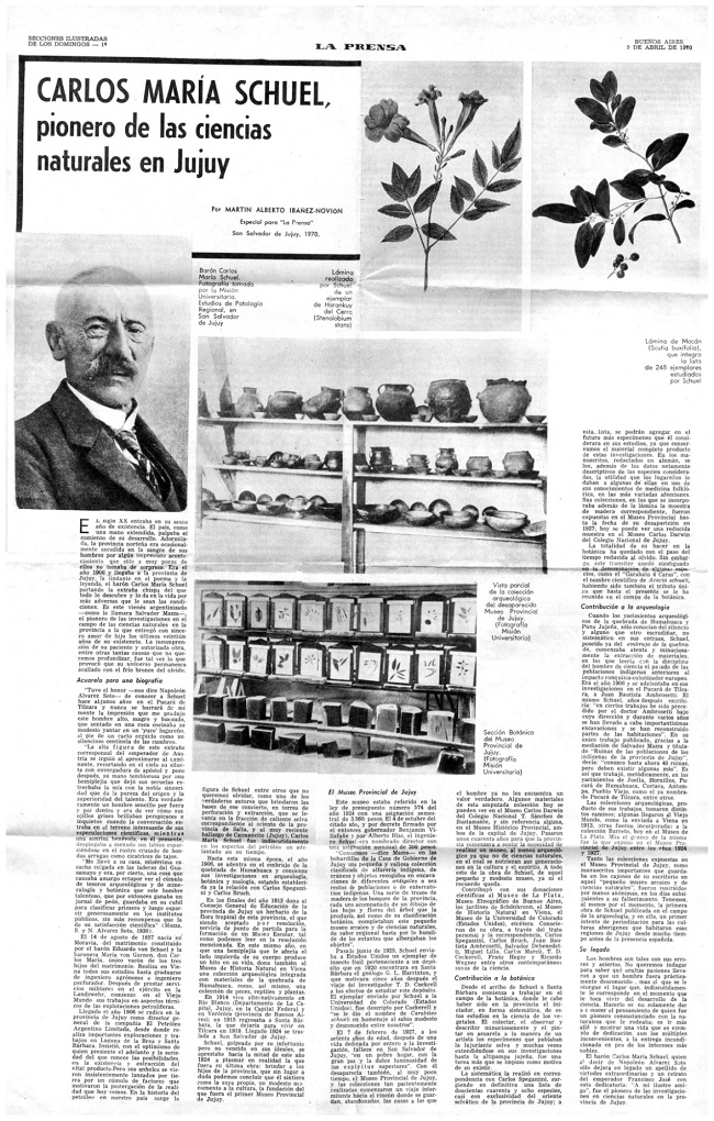 Una nota periodística encontrada en el acervo documental de la División Arqueología, mientras realizábamos la búsqueda de antecedentes documentales, nos permitió conocer mejor a Karl Schuel, el primer expedicionario contratado por Muniz Barreto. La nota es del diario La Prensa de Buenos Aires del 5 de abril de 1970 (Secciones ilustradas de los domingos), y se titula “Carlos María Schuel pionero en las ciencias naturales en Jujuy”, realizada por Martin Alberto Ibáñez-Novión.