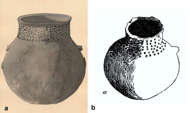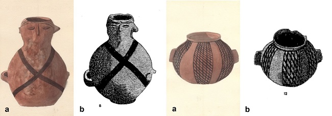 Las imágenes de las vasijas que aparecen retratadas en el artículo de Becker-Donner (1950), según la autora provienen de la Quebrada de Humahuaca, de los sitios del Pucará de Tilcara, Juella y Puerta de Juella, según la información brindada por Schuel. Como ya mencionamos, estas mismas piezas aparecen retratadas en las acuarelas de la Colección Muniz Barreto, lo que nos indicaría que fueron realizadas antes del envío de las mismas a Viena, ¿podría tratarse de obras pintadas por el mismo Schuel, si tomamos lo dicho en el artículo periodístico en relación a las acuarelas? (Fig. 4).