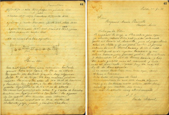 “Hemos empesado el trabajo en puevlo Juez de Maydana con 3 peones. El antigualesta situado en kilometro de ferrocarril 86 a 87 pasando al norte a la isquierda mas o menos un kilómetro”. Luego sigue su recorrido por el sitio Zenegillas “El antigualestamas o menos 12 kilómetros al Norte de Tilcara a I kilómetro a la isquierda del ferocarril, no estuvo tocado”… (Schuel 1919 p. 1).