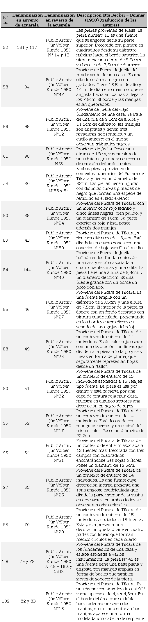 En su trabajo Becker-Donner investiga los estilos cerámicos pertenecientes a la alfarería enviada por Rudolf Schreiter y los de otra colección proveniente de la Quebrada de Humahuaca (Jujuy), enviada por Karl Schuel. En esta publicación encontramos ilustradas varias de las piezas retratadas en las acuarelas de la Colección Muniz Barreto, es decir, que en las acuarelas se encuentran retratadas piezas que fueron enviadas al Museo de Etnología de Viena, según el trabajo de Becker-Donner (1950), y que se encuentran allí (Fig. 3).