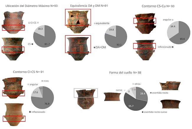 En relación a este conjunto de análisis, cabe destacar que la selección de estas variables y tipos de pruebas simplifica la forma real de las vasijas, y los resultados expresan únicamente relaciones entre las medidas. Así, en su conjunto, pueden considerarse como una herramienta útil para la comparación de las vasijas; sin embargo, varios de los atributos morfométricos no están representados y, por ende, piezas con dimensiones similares pueden presentar importantes diferencias en sus morfologías.