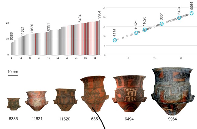 Análisis de los tamaños de las tinajas Belén según la media geométrica, calculada a partir de la medición de distintas zonas anatómicas de las vasijas (N=96). Arriba a la izquierda, las barras grises representan piezas de la colección, y las rojas, piezas de contextos no funerarios; a la derecha el gráfico muestra las agrupaciones por tamaños. Abajo, las vasijas numeradas en los gráficos. Piezas: MLP-Ar (n) 6356, 11621, 11620, 6351, 6494, MLP-Ar (b) 9964