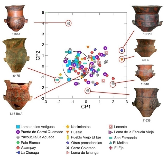 Gráfico obtenido en el análisis de componentes principales de las dimensiones de la muestra de tinajas Belén. Tomado de Iucci (2014). Piezas de la primera columna: MLP-Ar 11843 y (n) 6475; LI6BeA, de la segunda: MLP-Ar (n) 10329, 5095, 11640, 11638