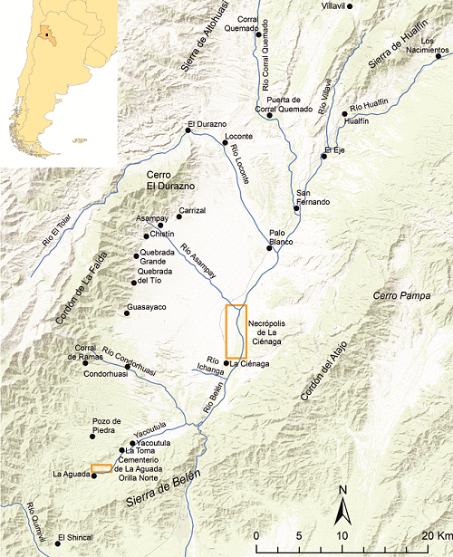 Una de las áreas donde se concentraron los trabajos de campo fue lo que actualmente es conocido en el ámbito académico como Valle de Hualfín, en la provincia de Catamarca –que corresponde a una parte del Norte de Belén, según la denominación entre los habitantes actuales– (Fig. 1). Allí, los integrantes de las expediciones permanecieron durante varias temporadas e instalaron sus campamentos en diferentes puntos del área, con la consecuencia de que la excavación de piezas tuvo numerosos epicentros y, por lo tanto, una vasta representatividad espacial. Se estima que el material de esta zona es de alrededor de 6000 piezas, que provienen de unas 1000 tumbas, ubicadas en las localidades de Puerta de Corral Quemado, Corral Quemado, Los Nacimientos, Hualfín, El Eje, San Fernando, Loconte, Palo Blanco, La Ciénaga, Asampay, Quebrada del Tío, Guasayaco, Corral de Ramas, Condorhuasi, Las Juntas, Pozo de Piedra, Yacoutula y La Aguada.