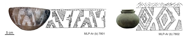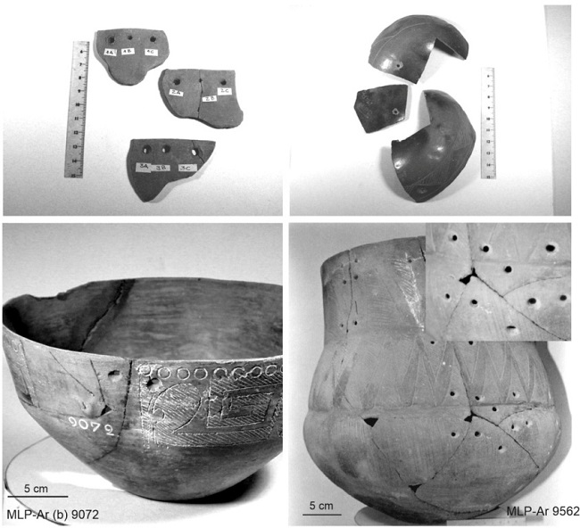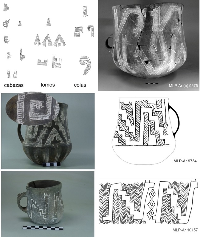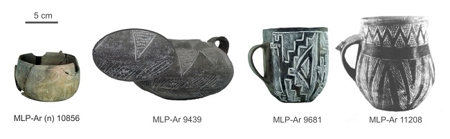 Ejemplos de vasijas Ciénaga que presentan características que dificultan la adscripción a los tipos de A.R. González. Vasija MLP-Ar10856, con diferentes coloraciones en una misma vasija. MLP-Ar 9439, 9681 y 11208 con combinación de diferentes grafías (incisiones finas, gruesas y puntos)