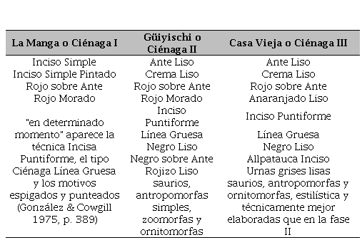 El lapso temporal que ocuparía la secuencia para la Cultura Ciénaga fue subdividido en tres fases, cada una caracterizada por los tipos (Tabla 1): La Manga o Ciénaga I (200-300 d.C.), Güiyischi o Ciénaga II (300-450 d.C) y Casa Vieja o Ciénaga III (450-600 d.C), considerada como una transición entre Ciénaga y Aguada. En esta última, los autores mencionan la aparición de tipos Aguada y luego, para las primeras etapas de Aguada, señalan la continuidad de tipos a los que denominan como Ciénaga de Transición: Allpatauca Incisa, Ciénaga Ante Lisa, Ciénaga Dibujos Negros, Ciénaga Negro sobre Ante, Ciénaga Negro y Rojo sobre Ante y Ciénaga Línea Gruesa.
