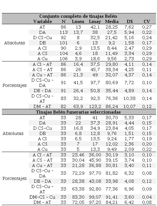 Referencias. Lmen = límite menor, Lmay = límite mayor, DS = desvío estándar, CV = coeficiente de variación, AT = altura total, DA = diámetro de abertura, D = diámetro, A = altura, CI = cuerpo inferior, CS = cuerpo superior, Cu = cuello, DB = diámetro de base, DM = diámetro máximo