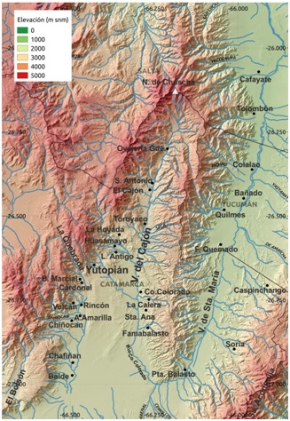 Durante la década de 1990 se efectuaron tres temporadas de excavación en Yutopián, un sitio en el valle del Cajón (Catamarca, Argentina). La configuración de los hallazgos arqueológicos no se ajustó a lo esperado. En primer lugar, no se preveía que un asentamiento del período Formativo (PF) (500 AC a 1000 DC)[i] en el área Valliserrana del Noroeste argentino (NOA) ocupara localizaciones elevadas como ocurre en los sitios defensivos del período Tardío o período de Desarrollos Regionales (PDR) (1000 a 1470 DC), pero Yutopián mostraba ocupaciones formativas en una localización topográfica prominente. Segundo, en los cuadros cronológicos y mapas corográficos más difundidos del NOA prehispánico se había establecido que los estilos cerámicos Candelaria y Tafí se desarrollaron al este de la región Valliserrana en áreas bien delimitadas (González 1963, 1977, Fig. 26; Tartusi & Núñez Regueiro 2001, Fig. 1), pero los encontrábamos en un valle semiárido al borde de la Puna. Tercero, tampoco era usual encontrar el trabajo de metalurgia junto a la preparación de alimentos (Núñez Regueiro 1994, Angiorama 1995), sin embargo, Yutopián mostraba producción metalúrgica en una cocina. Por último, la idea prevaleciente entonces era que los asentamientos formativos de los valles, con énfasis en la agricultura[ii], fueron creciendo por fisión y en forma replicativa, “homeostáticamente”, por toda la extensión del paisaje y tenían bajo nivel de integración social (Berberián & Nielsen 1988, p. 49, Olivera 2001, p. 92, cf.Tarragó 1996), pero Yutopián sugería un crecimiento interno del asentamiento en un mismo y único lugar desde el PF hasta fines del PDR.[iii]