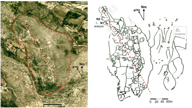 Es una colina flanqueada por dos cauces de agua (-26,642329, -66,427164), elevada unos 50m sobre el fondo de una planicie suavemente inclinada. Las construcciones visibles de piedra ocupan la parte superior y las laderas de la loma (Figura 2). El sitio mismo abarca un área de 300m de largo por 100m de ancho. Desde su base y antes de ascender se observan hileras sucesivas de muros de piedra: son construcciones aterrazadas que la bordean por toda su parte este. Existe una gran variación en la hechura de los recintos, en su forma y su tamaño y hay una decena de concentraciones de recintos compuestas por estructuras adosadas que consideramos las áreas de habitación y denominamos “núcleos”. Entre ellos hay estructuras más amplias –probablemente recintos agrícolas y corrales– y varias áreas abiertas.