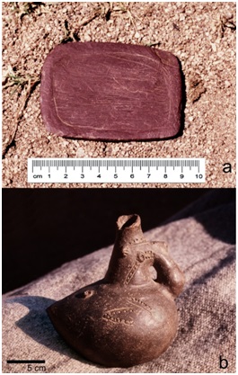 La superficie del sitio reveló concentraciones densas de tiestos lisos y decorados correspondientes a varios tipos conocidos de la región: diferentes clases de grises pulidos, grises incisos, Condorhuasi policromo, Condorhuasi rojo sobre ante, Río Diablo gris inciso, fragmentos pintados en negro sobre rojo y también del estilo Santa María tricolor y bicolor. El material lítico fue especialmente abundante y variado; comprendía lascas, desechos e instrumentos como puntas de proyectil de diversas materias primas, incluida la obsidiana, y cuchillos de pizarra. También había morteros y molinos muebles y fijos de piedra, una tableta de piedra laja para inhalar (Figura 3) y dos láminas metálicas. En especial, la instalación en posición destacada y la posibilidad de varias ocupaciones reclamaban un tratamiento especial.
