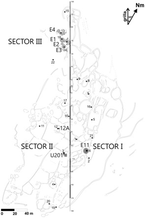El pozo de sondeo PP3 (Figura 4) fue ubicado entre dos hileras de piedras que parecían definir un espacio intramuros que fue referido, de manera provisoria, como “pasillo”; estaba cubierto con material de superficie que incluía abundante cerámica gris pulida y lascas de obsidiana. El sondeo avanzó hasta los 30cm de profundidad –desde la superficie del suelo actual– donde se alcanzó la roca de base, por lo que demostró no corresponder a un pasillo de entrada al recinto adyacente sino constituir, probablemente, un relleno de pared doble. Proporcionó cerámica del PF y del PDR, la primera en mayor cantidad que la segunda. También se encontraron fragmentos de hueso de un cráneo humano en el ángulo sudeste de la unidad. Para ampliar el área de excavación, se dispusieron primero dos unidades adyacentes de 1x1m que se denominaron, en conjunto, U201. Luego se expandieron otros 3 m2 –unidades U202A, U202B y U202C– de modo que, finalmente, las cinco unidades adicionales de 1x1m fueron denominadas conjuntamente como Sector II (Figura 23).