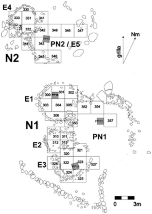 El sector norte seleccionado para un estudio más intensivo –también denominado Sector III– está constituido por recintos que tienen la apariencia de dos conjuntos habitacionales; los denominamos Núcleos 1 y 2 (Figura 5). El Núcleo 1 consiste en un grupo de estructuras, E1, E2 y E3, apartadas unos 5m de otras dos, E4 y E5, las cuales constituyen el Núcleo 2. Ésta ha sido una designación operativa basada en la arquitectura superficial y no se asume la existencia de igual cantidad o identidad de unidades familiares o domésticas representadas. Alrededor de estos núcleos hay indicaciones de otras estructuras perturbadas por instalaciones modernas, así como también, muros de contención y paredes (pircas) sueltas. Al oeste de ambos núcleos se hallaron los restos de una acequia construida en piedra. Las tres estructuras de Núcleo 1 se abren hacia el este a un gran espacio subcircular o patio que fue denominado Patio 1 (PN1). Las excavaciones probaron que E4, abierta al este, se conecta con la E5, la cual presenta las características de un patio amplio, también llamado PN2.