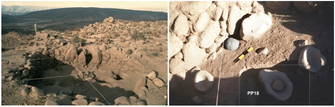 El piso de ocupación superior también brindó artefactos líticos –raspadores y lascas–, así como restos óseos de camélidos, entre ellos, mandíbulas y dientes, además de numerosas placas de quirquincho. También se obtuvieron muestras de restos vegetales carbonizados. No se localizó ningún fogón formalmente constituido sino solo áreas del piso quemadas, algunas con lentes de ceniza y hueso calcinado. Además, el centro de la estructura estaba ocupado por un gran peñasco fijo, ahuecado en el medio, el cual, luego se reveló que emergía desde la roca de base, a mayor profundidad. (Figura 21). Puede haber funcionado como base de poste para el techo.