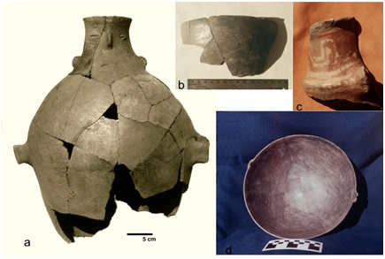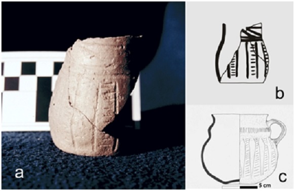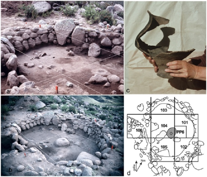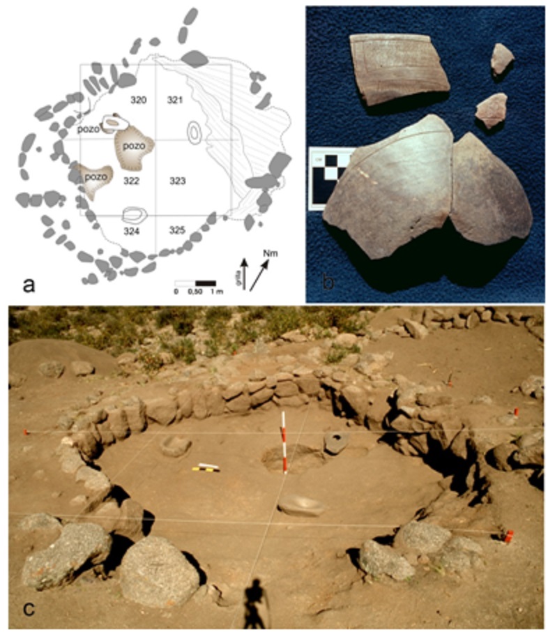 También de aquí se recuperaron materiales cerámicos, algunos parcialmente reconstruibles (Figura 20), como el jarro Gris inciso, cuya decoración y forma corresponde al tipo Aconquija Inciso B definido por Núñez Regueiro para la zona de Alamito (1975, p. 351), pero que también podría ser afín al tipo Ciénaga Inciso Simple (Figura 20c) de la fase La Manga (Ciénaga I) del valle de Hualfín (González & Cowgill 1975, p. 288). Había además artefactos y desechos líticos tallados, restos óseos faunísticos (Izeta 2004) y varios artefactos líticos pulidos como manos y conanas. Se obtuvieron también muestras de restos vegetales carbonizados por medio de flotación del sedimento, particularmente en pozos y en zonas de suelo oscuro.