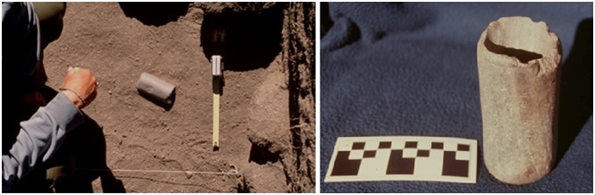 Como evidencia remarcable se ha hallado en el interior del pozo de mayores dimensiones fragmentos de cerámica con representaciones de rostros en el cuello confeccionadas mediante la aplicación de tiras al pastillaje e incisiones de puntos de estilo Candelaria y fragmentos pintados en negro y blanco sobre un engobe rojo de estilo Condorhuasi, entre otros. Aparte de la cerámica, la ocupación más antigua reveló otros indicadores de actividades domésticas tales como restos óseos y artefactos líticos en diversas etapas de producción y uso. La muestra de carbón #4 (1830 ± 60 AP, Tabla 3) que está asociada a tales tiestos proviene del fondo del pozo (Figura 11). De manera que podría haber unos cuatro siglos de diferencia en el uso de esos dos contextos datados.