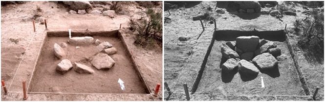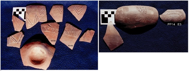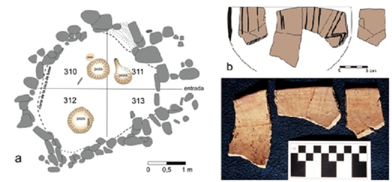 Una cuadrícula separada, la U357, se cavó a fin de investigar un conjunto de piedras que sobresalían en superficie y cuya configuración hizo considerarlo un rasgo especial. Este rasgo reveló que estaba constituido por piedras, varias de ellas tabulares, colocadas de manera vertical y en círculo, rodeando una piedra central en posición horizontal (Figura 12). En relación con este rasgo se hallaron fragmentos de pucos de estilo Aguada Gris Grabado con motivo zoomorfo y otros de un tipo cerámico con motivos geométricos dibujados en blanco y negro sobre un fondo ante-naranja (Figura 13). Algunos fragmentos similares habían sido hallados antes en la estructura E2 y en el sondeo PP14 de E3, los cuales deben corresponder a cada una de las vasijas halladas semicompletas en asociación con este rasgo. El estilo de la alfarería pintada lo denominamos Geométrico Polícromo y no le encontramos afinidades claras con otros tipos conocidos. Mientras que el puco con diseño zoomorfo corresponde claramente al estilo Aguada. Ello sugiere que este rasgo corresponde a un evento posterior (intrusivo) al uso del patio N1 durante la ocupación de E1, aunque no queda clara una asociación física directa con E2 o con E3. Por su configuración, asociaciones, presencia de cuencos finos para servir y analogía con estructuras similares actuales, puede haber sido un receptáculo de ofrendas (Yacobaccio & Malmierca 2006).