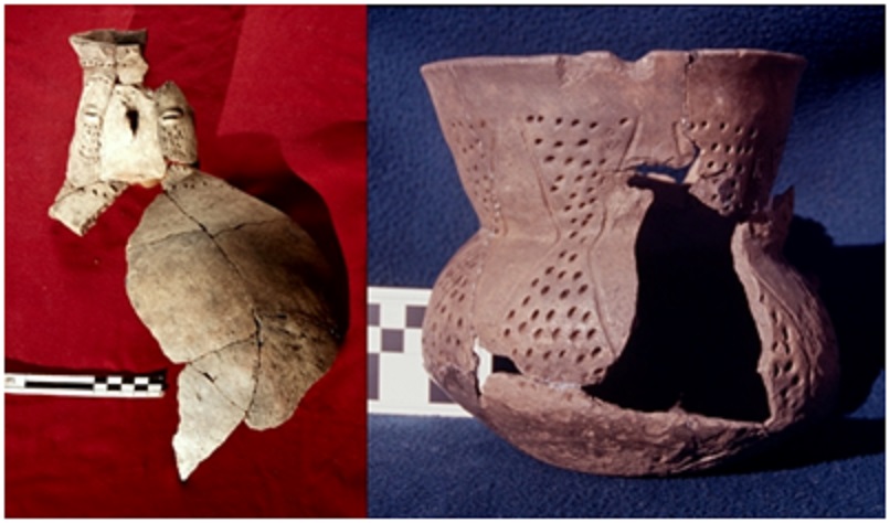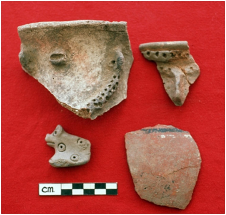 Al oeste del fogón se halló una distribución extendida de fragmentos cerámicos que pertenecen a dos vasijas de tamaño grande. Tienen un cuello restringido y cuerpo globular; presentan diferentes patrones decorativos. La más sencilla tiene únicamente una tira aplicada al pastillaje con incisiones diagonales en la base del cuello. La más elaborada es una olla con una representación antropomorfa incisa y punteada en el cuello de la vasija que representa una estilización de un rostro con líneas extendiéndose debajo de los ojos (Figura 7a) y tiene dos asas laterales.Su similitud con la decoración presente en el estilo Candelaria condujo a su asignación a este estilo. Su presencia también es común en sitios del valle de Tafí. Se verá más adelante que se encontraron otros ejemplares similares en el resto de las excavaciones en Yutopián. Hay que señalar que algunas de las vasijas de esta clase poseen una delgada cobertura blanca por toda la superficie de la pieza y que este tratamiento también ha sido detectado en asentamientos de tipo Tafí en la Quebrada de La Ciénega por Beatriz Cremonte (2003, p. 63). Junto a esta cerámica se hallaron otros restos: entre los más notables, un conjunto de varios porotos carbonizados (Gero 2015, Fig. 50) y varias lascas de obsidiana. Cerca de estos tiestos también se halló una figurina cerámica zoomorfa de cuerpo alargado, cola larga y cuatro patas que carece de cabeza (Gero 2015, Fig. 82), similar a las que se han encontrado en La Bolsa del valle de Tafí (Salazar 2011, Fig. VIII.13).