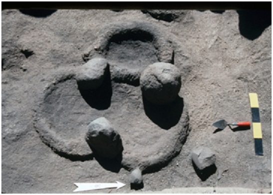 En el interior de la estructura y en relación con el piso de ocupación, los hallazgos de artefactos se distribuyen de una manera organizada. Al centro y este se ubica el fogón compuesto por un anillo sobreelevado de arcilla endurecida y quemada junto con cuatro piedras firmemente adheridas como para servir de apoyo a un recipiente (Figura 6). En relación con este rasgo había trozos de hueso quemado y varios porotos carbonizados, lo cual sugirió que el fogón fue usado para cocinar alimentos. Pero, además, en relación con él, también se halló una cantidad apreciable de material burbujeante (vitrified fuel ash), que es un producto residual de actividad pirotecnológica, cuyo análisis indicó una composición de suelo vitrificado[ix]a 1000ºC, una temperatura significativamente superior a la necesaria para fogones culinarios, la cual es más bien propia de una combustión relacionada con la metalurgia (Van Diver 1994, Gero & Scattolin 2002). Junto con esta evidencia había, además, un trozo de materia prima identificada como mineral de cobre –probablemente malaquita–[x]. Estos hallazgos, junto con varios otros de la vecina estructura E2, como algunos martillos de laminación quebrados, hacen suponer que en el Núcleo 1 están representadas algunas etapas del proceso de producción de artefactos metálicos que involucraron su fogón principal.