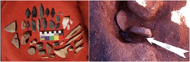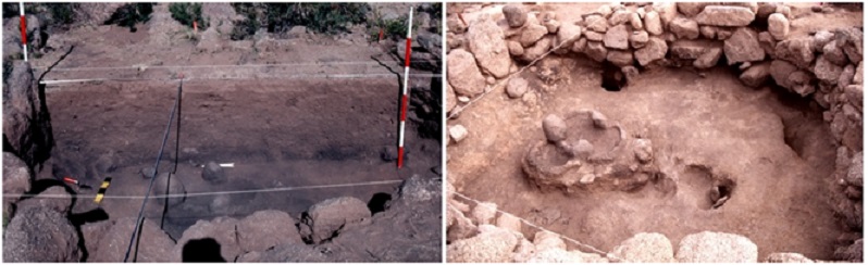 Finalmente, al fondo de la excavación, apareció la roca de base donde se encontraron varios pozos cavados. Un pozo singular, más pequeño, presentó características especiales, ya que contenía puntas líticas de obsidiana y artefactos de basalto, restos óseos y pigmento ocre. Sobre estos objetos había varias rocas naturales redondeadas y muy lisas, posiblemente escogidas, por todo lo cual se interpretó como un escondrijo o receptáculo en la base del hoyo de poste principal de la vivienda (Figura 19).