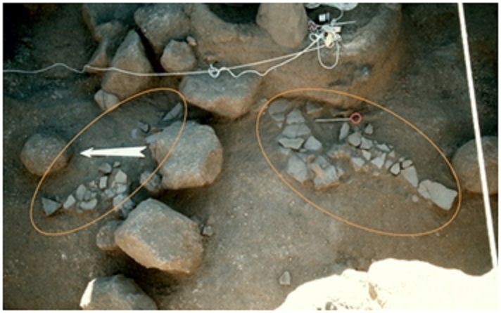 Continuando la excavación, se halló una oquedad alargada que entraba oblicuamente en la roca de base por abajo de un borde saliente. El hueco, que se localizaba por debajo del entierro, proporcionó varias herramientas de piedra grandes, una punta de proyectil de obsidiana, una mano redonda, varios tiestos de cerámica grandes, restos óseos animales y un cuchillo de pizarra, asignables –de manera preliminar– al PF.