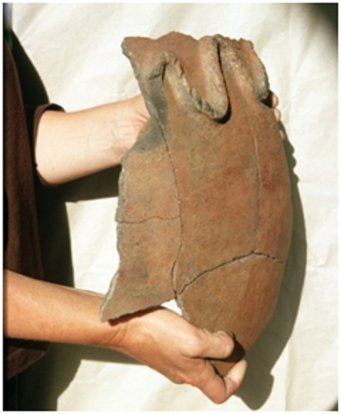 Se decidió conservar intacto este distintivo fogón como un rasgo de preservación especial que, al término de la excavación del recinto, fue cubierto cuidadosamente de tierra. De manera tal que la ocupación inferior –más comprimida– fue detectada únicamente al profundizar la excavación todo en derredor del mencionado fogón (Figura 17). Esta ocupación inferior por lo tanto no se pudo observar por debajo de tal rasgo, sin embargo, su existencia se verificó por conjuntos de fragmentos remontados que resultaron de la presencia de vasijas quebradas de material cerámico ordinario que constituyen partes de ollas de cocina (Figura 18). Se observaron alrededor del fogón principal y extendiéndose por debajo de él.