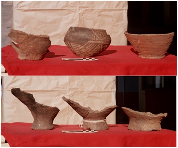 La cerámica tardía comprendía cuencos abiertos de cuello corto pintados en negro sobre blanco de estilo Santa María (Podestá & Perrota 1973, pp. 10-11, Marchegiani 2012, Tarragó et al. 2017, cf. Bugliani 2018, Figura 6), una olla globular con cuello, vasijas grandes de paredes gruesas con superficies peinadas y bases muy estrechas y altas, como pedestales (Figura 22) (cf.Debenedetti 1921).
