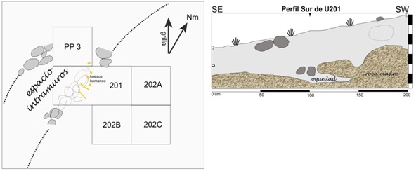 La unidad U201 incluyó la hilera oriental del espacio intramuros y la parte del interior de la estructura adyacente. Los bloques correspondientes a la hilera de piedras fueron removidos y se descubrieron los restos de un entierro, muy aplastado, primero la escápula, luego las costillas y por último los brazos doblados debajo del cuerpo. Su situación indicaba que el cuerpo había sido colocado antes de que se construyera el muro, no obstante, no se percibió ninguna cámara de entierro preparada. Un hueso largo del esqueleto procedente del nivel N5 (40-50cm) de la U201 proporcionó la fecha de 1811 ± 50, AA102678, Tabla 3, #6 (cf.Gero 2015, pp. 67-71).