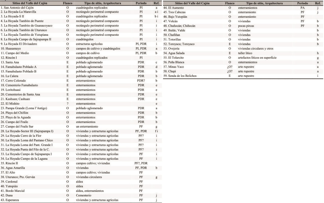 El conjunto de la información condujo a una comprensión preliminar del patrón de asentamiento a través del tiempo. La mayoría de los sitios arqueológicos conocidos del valle (Tabla 1) corresponden a los períodos más recientes: PDR (1000-1480 DC) y PI (1480-1535 DC). Varios sitios del PI se localizan en la vertiente oeste; los sitios aglomerados del PDR parecen estar concentrados en las quebradas secas del flanco oriental; mientras que sólo se han registrado asentamientos formativos en la vertiente occidental de la sección central del valle, que ofrece las mejores condiciones para el laboreo agrícola. Durante el PDR varios asentamientos siguieron ocupando esta ladera donde se hallan asociados a construcciones para el laboreo de la tierra (Campo del Medio, Huasamayo), pero en algún momento del PDR comenzó a utilizarse también la escarpada vertiente este, con poblados en posiciones encubiertas y de acceso muy escabroso. Se advierte entonces una concentración de la población con claros propósitos defensivos, puesto que varios poblados aglomerados –como los de Famabalasto y La Calera (Weiser 1922)– se construyeron en localizaciones altas estratégicas, en el interior de las quebradas cortas y abruptas, de difícil ascenso, muy alejadas de terrenos apropiados para el cultivo.