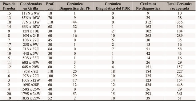 A fin de conocer la historia ocupacional en el centro-oeste de la loma, durante el muestreo inicial del sitio (Figura 4), se estableció el sondeo PP12, de 1x 1 m que fue cavado por niveles artificiales de 10cm. Hacia los35cm de profundidad desde la superficie del suelo, se descubrió el borde de un pozo cavado en la roca de base que ocupaba la mitad sudoeste de la cuadrícula (Gero 2015, Fig. 75), la que finalmente se abandonó luego de hallar piedras en su fondo que no permitían avanzar más en profundidad. No obstante, los materiales cerámicos extraídos indicaron que también en esta zona del sitio había una ocupación formativa.