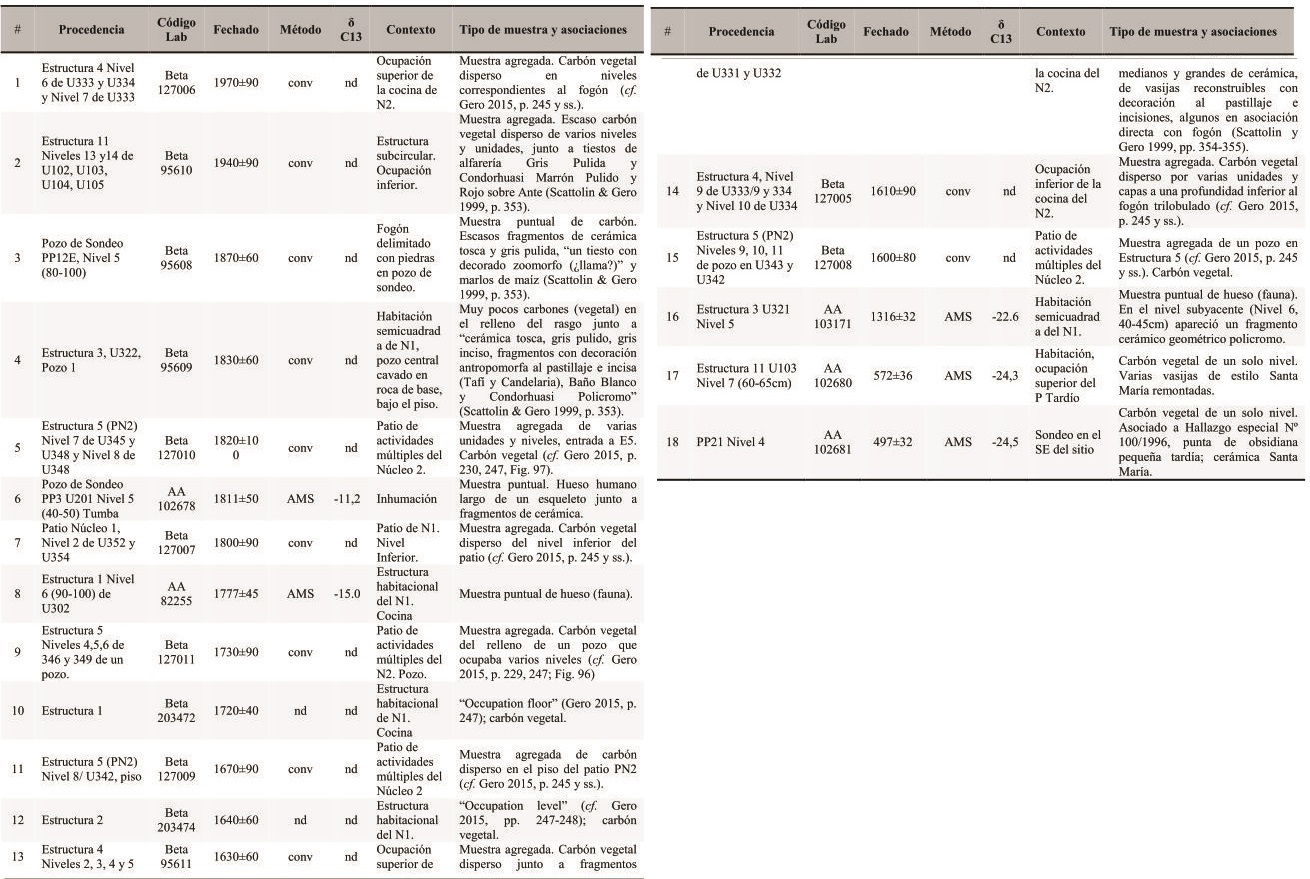 Escasos trozos de carbón vegetal dispersos –asociados a tiestos de alfarería Gris Pulida y Condorhuasi Marrón Pulido y Rojo sobre Ante (Scattolin & Gero 1999, p. 353)– suministraron una muestra agregada procedente de los niveles N13 y N14 de las unidades U102, U103, U104 y U105, cuya datación dio la fecha radiocarbónica de 1940 ± 90 años AP (Beta 95610). Teniendo en cuenta esta fecha y los materiales cerámicos diagnósticos de una y otra ocupación se infiere que pudo haber transcurrido un lapso de más de mil años entre ambas, del que no se han conservado evidencias.