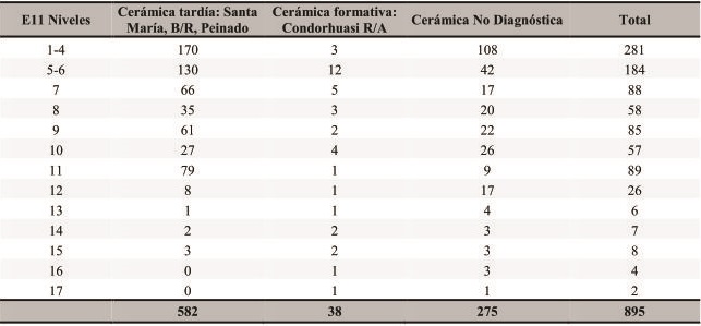 La excavación de la estructura E11 se realizó de forma intermitente en tres etapas. En 1994 se ubicó el Pozo de Prueba PP6 dentro de un recinto subcuadrangular, de unos 5x5m, construido contra los muros de una terraza en la zona central de Loma Yutopián que denominamos Sector I. El PP6 produjo fragmentos de cerámica claramente estratificados; tiestos del PDR ocupaban mayormente las capas superiores, las cuales cubrían un componente del PF (Tabla 4). Luego el PP6 fue expandido a un bloque de excavación de 2x2m que se denominó U101. Esta segunda etapa de la excavación confirmó la existencia de una ocupación formativa sustancial en la parte central y oriental del sitio. Los niveles superiores contenían hallazgos rotos (se notó una conana rota y una mano rota a los 50cm de profundidad) y cerámica Santa María más varios tiestos del PF (grises incisos, Condorhuasi rojo sobre ante).