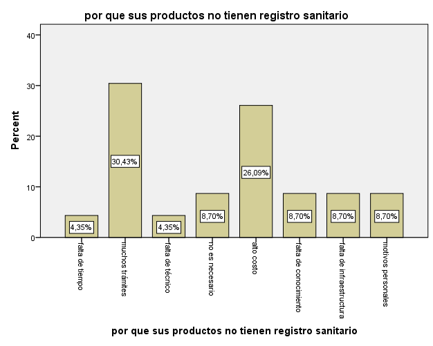 Además, se concluye que las razones más representativas para que exista resistencia por parte de los artesanos que procesan alimentos agrícolas para la aplicación del certificado sanitario se debe a muchos trámites 30,43% y un alto costo económico 26,09%. Tan solo el 25,63%, es decir 41 productores sí procesa alimentos agrícolas y de estos, solamente el 20%, es decir 8 productores manifestaron que sus productos sí cuentan con el certificado sanitario. De lo cual se evidencia que la aplicación del certificado sanitario es muy baja.