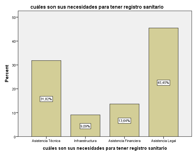 Otro resultado representativo muestra que, de 160 encuestados, 41 manifestaron procesar alimentos agrícolas y de estos 41 productores tan sólo el 20%, es decir 8 productores manifestaron que sus productos cuentan con el certificado sanitario. La Grafica N° 1 representa las razonas por las cuales no poseen registro sanitario para sus productos. La Grafica N° 2 denota que del total de productores/artesanos que no tiene registro sanitario (un número de 33 personas); el 45,45% necesita asistencia legal y el 31,82% asistencia técnica.